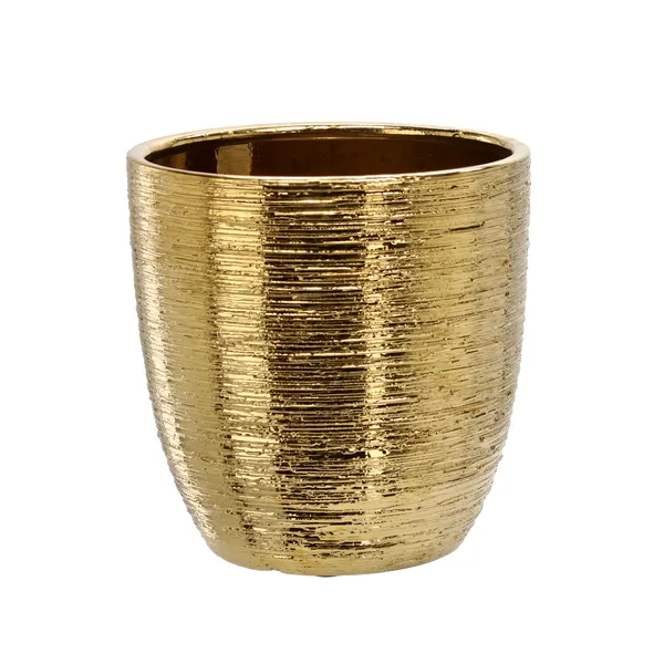 Exkluzív arany színével a kerámia kaspó azonnal elegáns fókuszpontot teremt, miközben masszív, karcálló kialakítása hosszú távon védi és stabilan tartja a növénycserepet. Ideális közepes és nagyobb szobanövényekhez, sima felülete egyszerűen tisztítható, így a dekoráció mindig ragyogó és hosszú élettartamú marad.