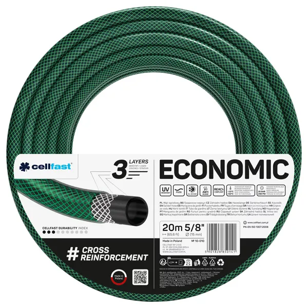 A Cellfast Economic kerti locsolótömlő megbízható választás a kert öntözéséhez és a növények mindennapi locsolásához. UV-álló kialakítása segít, hogy napsütésben is tartós maradjon, miközben a belső felület anti-alga védelemmel támogatja a tiszta vízáramlást. Rugalmas felépítése megkönnyíti a használatot, a feltekerést és a tárolást.