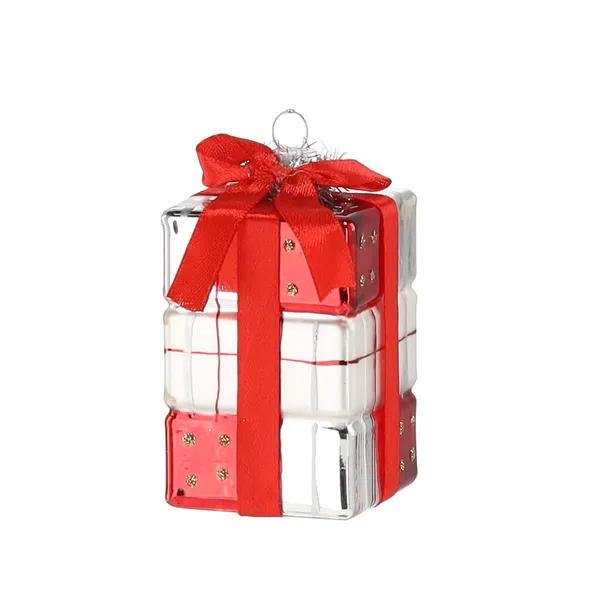 Üveg karácsonyi dísz – fehér-piros ajándékdoboz, 4,7×4,7×8,3 cm