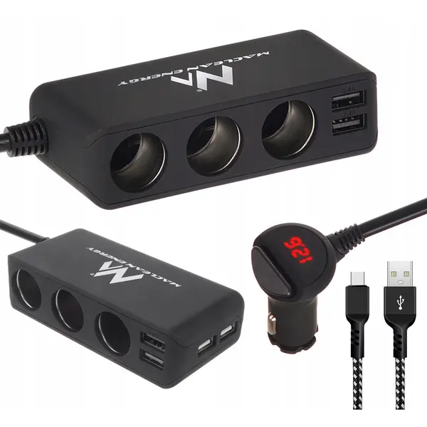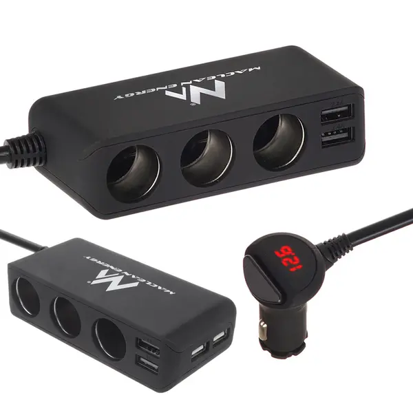 • Autós szivargyújtó elosztó 12–24 V, 3 aljzat + 4× USB, voltmérő