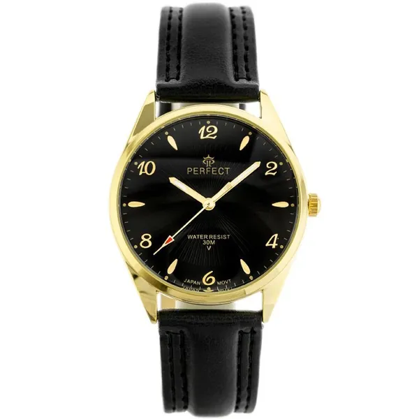 • Férfi karóra fekete bőrszíjjal, arany-fekete számlappal