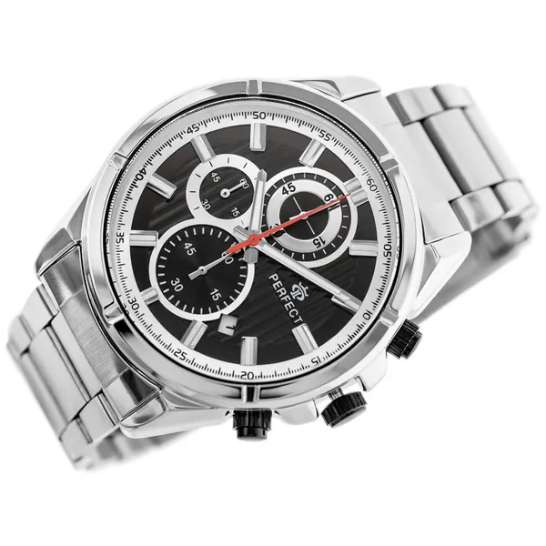 • Férfi karóra kronográffal, fekete számlappal, ezüst fém szíj