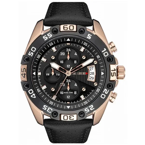 • Férfi karóra fekete bőrszíjjal, fekete számlappal, kronográffal