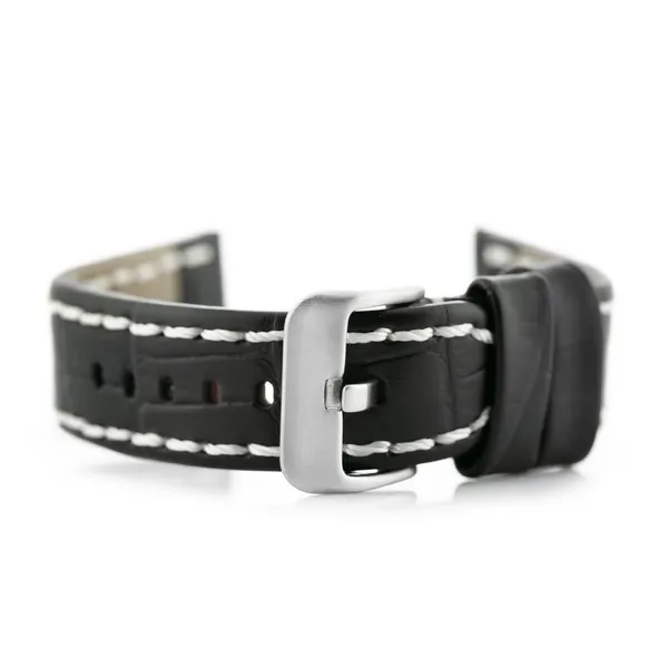 • 20 mm-es fekete valódi bőr óraszíj fehér varrással