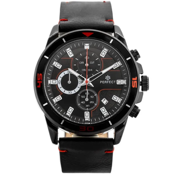 • Férfi karóra kronográffal, fekete bőrszíjjal, fekete számlappal