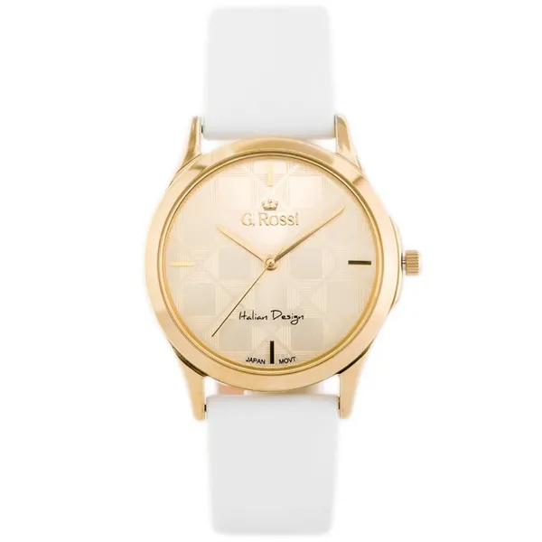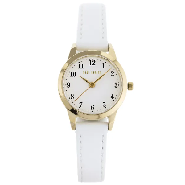 • Női karóra fehér bőrszíjjal, aranyszínű tokkal, 26 mm