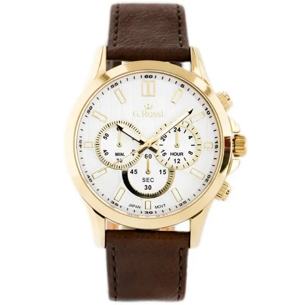 • Férfi kvarc karóra bőrszíjjal, ezüst számlappal, arany tok