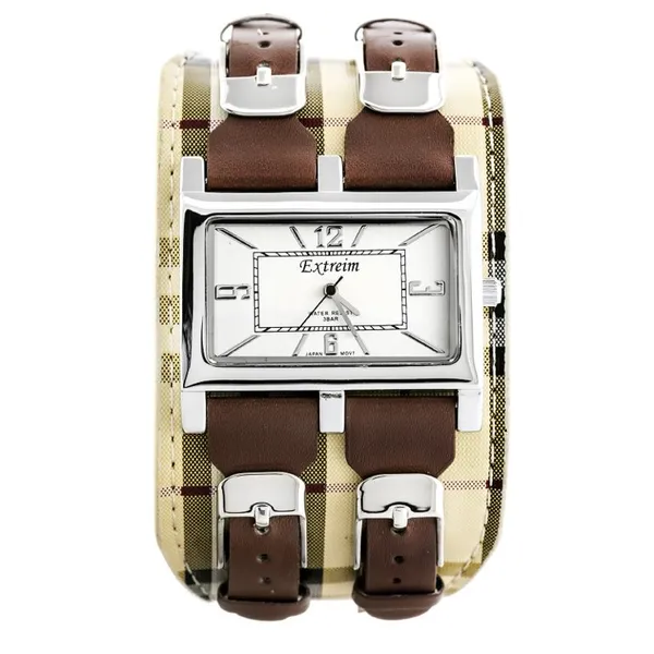 • Női kvarc karóra téglalap tok, ezüst számlap, barna szövet szíj