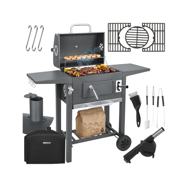 • Kerti faszenes grill fedéllel, hőmérővel, öntöttvas ráccsal 110x105x50 cm