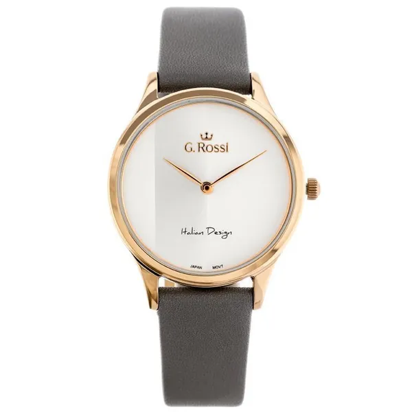 • Női kvarc karóra bőrszíjjal, szürke, fehér számlap, rózsaarany tok