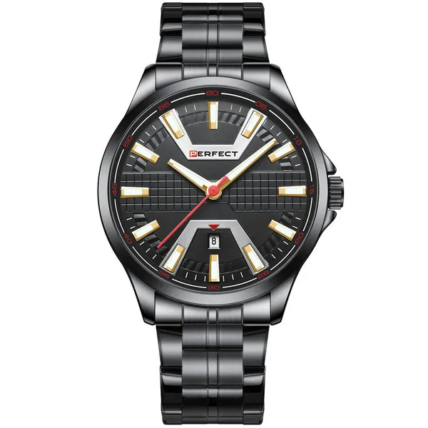• Perfect férfi кварc karóra, fekete-arany, fém szíj, dátum, 46 mm