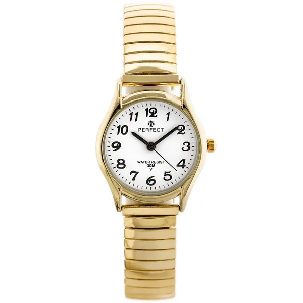 • Női кварc karóra fehér számlappal, aranyszínű fém karkötővel