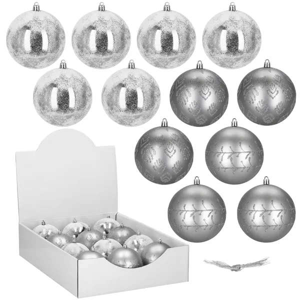• Ezüst műanyag karácsonyfadísz szett 12 db, 9,5 cm, törésálló
