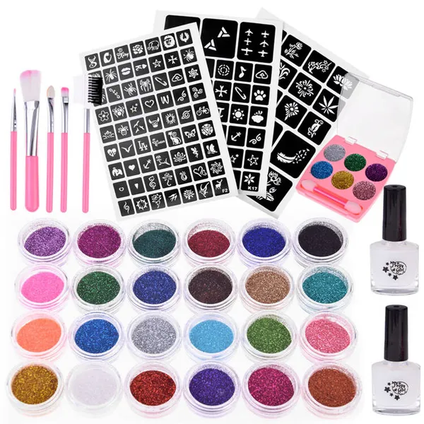 • Csillámtetoválás készlet 24 színnel, 120 sablonnal gyerekeknek