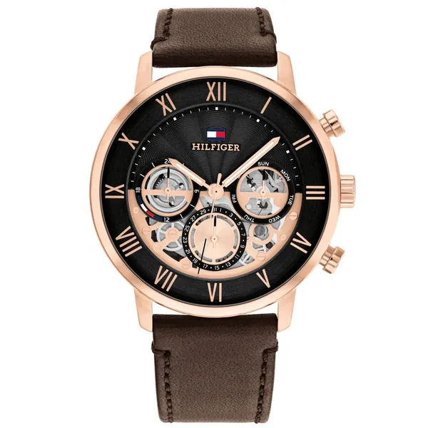 • Tommy Hilfiger férfi karóra 44 mm, fekete open-heart, barna bőr