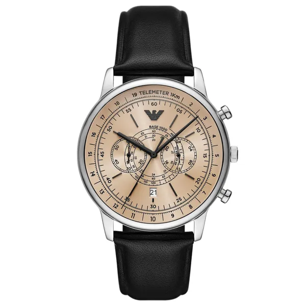 • Emporio Armani férfi karóra kronográffal, bőrszíjjal, bézs számlappal