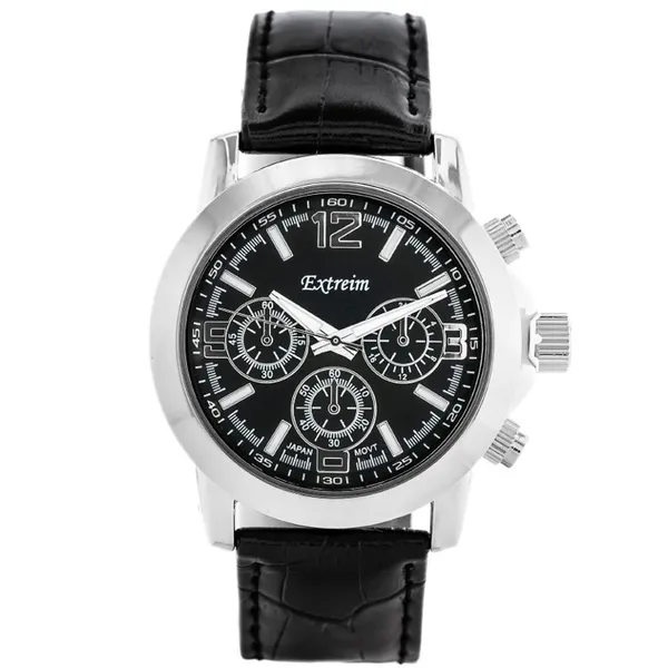 • Férfi kvarc karóra fekete bőrszíjjal, fekete számlappal, WR30