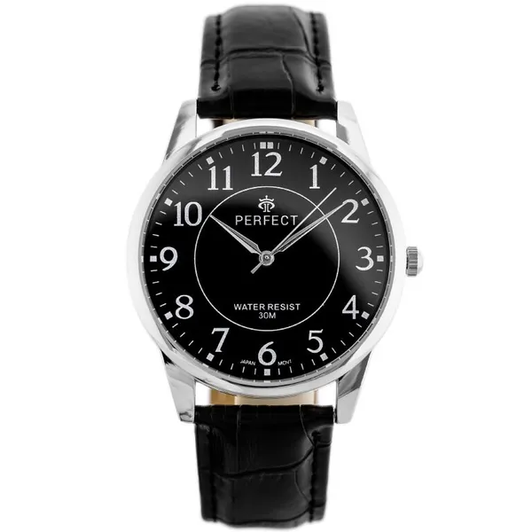 • Perfect B7381 férfi karóra, fekete számlap, bőrszíj, ezüst tok