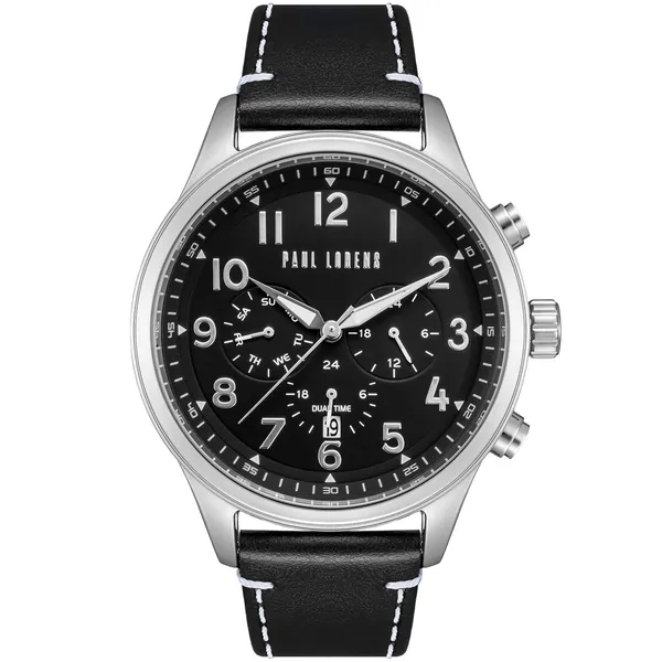• Paul Lorens férfi karóra fekete bőrszíjjal, dual time, dátum
