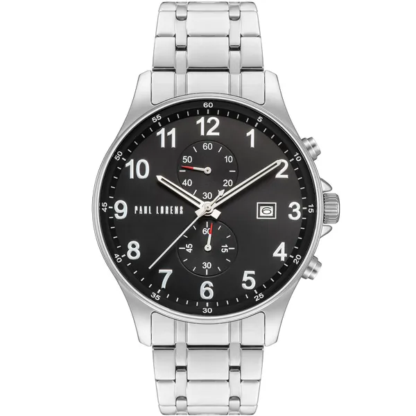 • Férfi karóra fekete számlappal, ezüst acél szíjjal, kronográffal