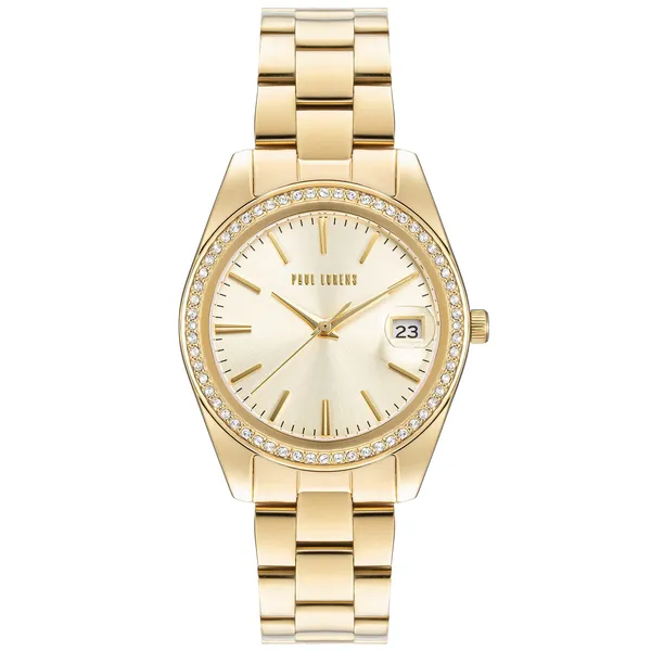• Női arany karóra cirkóniás tokkal, acél szíjjal, dátummal