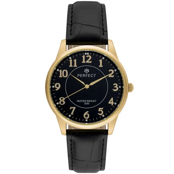 • Férfi karóra fekete számlappal, arany tokban, fekete bőrszíjjal