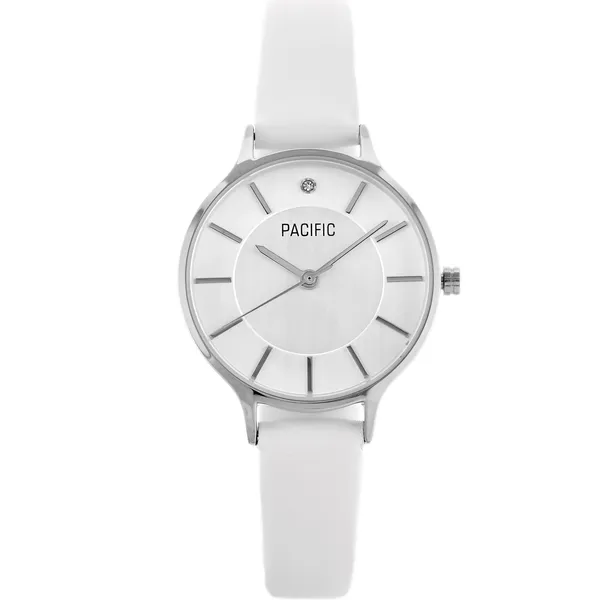 • Női kvarc karóra ezüst számlappal, fehér bőrszíjjal 30 mm