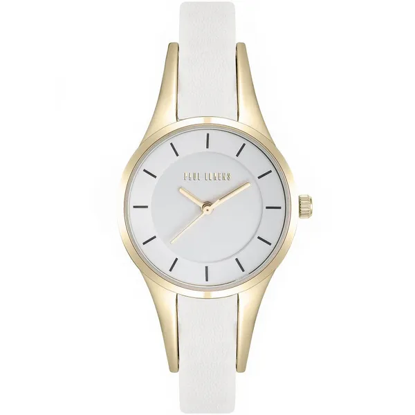 • Női kvarc karóra fehér bőrszíjjal, aranyszínű tokkal, 30 mm