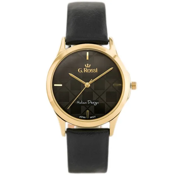 • Női kvarc karóra fekete bőrszíjjal, arany tok, fekete számlap