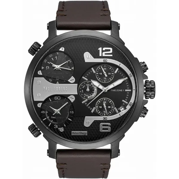 • Férfi karóra fekete számlappal, barna bőrszíjjal, kronográffal