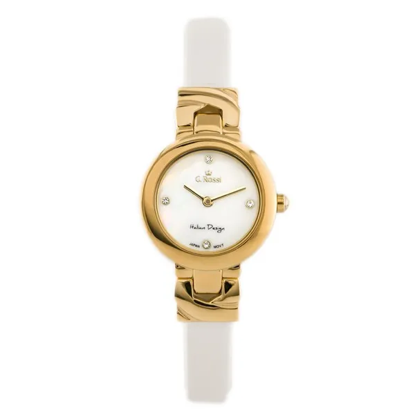 • Női kvarc karóra fehér bőrszíjjal, aranyszínű tokkal