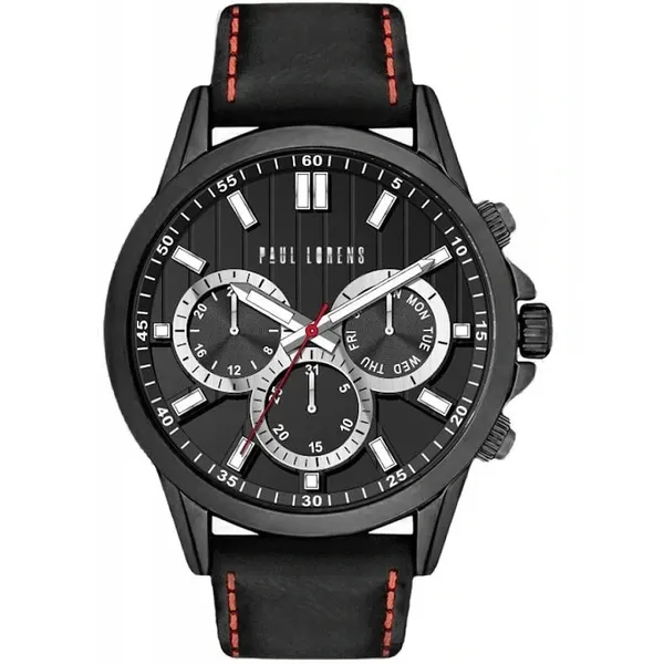 • Férfi karóra fekete bőrszíjjal, fekete számlappal, 44 mm