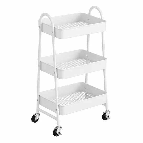 • Fehér 3 szintes gurulós fém tárolópolc fékezhető kerekekkel