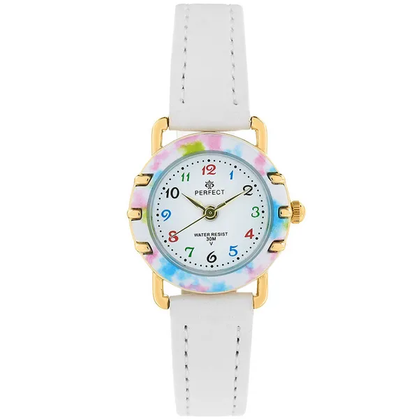 • Lány gyermek elsőáldozási karóra fehér bőrszíjjal, díszdobozban