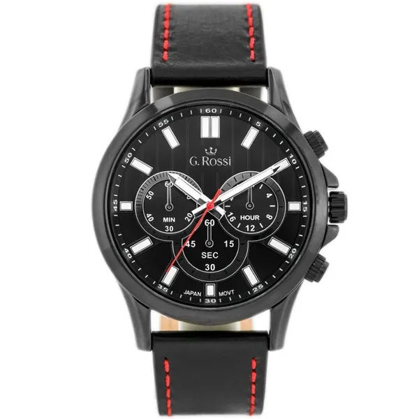 • Férfi kvarc karóra fekete bőrszíjjal, fekete számlappal