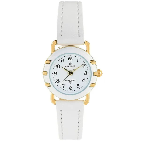 • Lány elsőáldozási karóra fehér szíjjal, arany színű tokkal