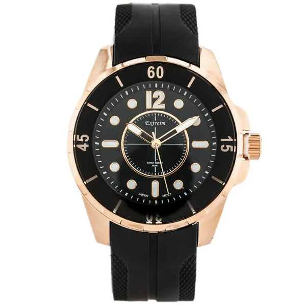 • Férfi кварц karóra fekete gumiszíjjal, fekete számlappal, розé arany