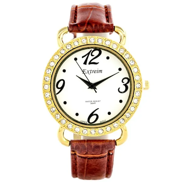 • Női kvarc karóra fehér számlappal, arany tokkal, barna szíjjal