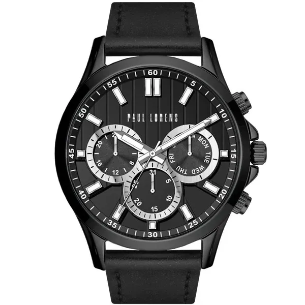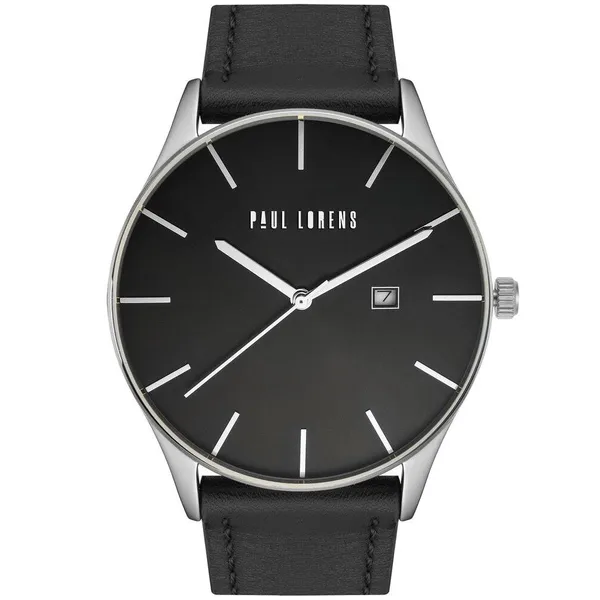 • Paul Lorens férfi кварц karóra, fekete bőrszíj, fekete számlap