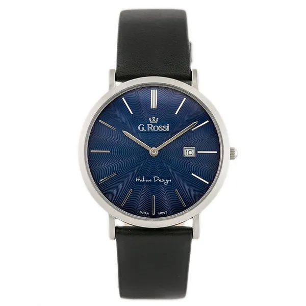 • Férfi karóra vékony ezüst tokban, kék számlappal, fekete bőrszíjjal