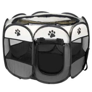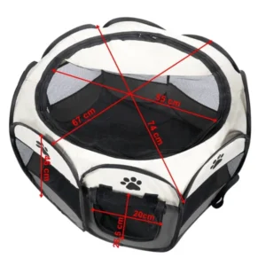 Összecsukható, nyolcszög alakú, textilből készült járóka kutyák, kölyökkutyák, macskák és kisállatok számára. A járóka ideális megoldás az állattartók számára , különösen akkor, ha biztonságos helyet kell biztosítaniuk kedvenceiknek. A termék otthoni és kültéri használatra egyaránt alkalmas.