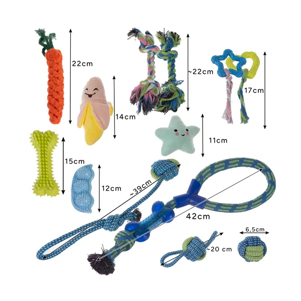 Gumihüvely: 12 × 5 cm • Csillag plüss: 11 × 11 cm • Könnycsepp csillag: 17 × 7,5 cm • Szív alakú húzó: 17 × 6,5 cm • Húzó labdával: 38,5 cm (Ø 7,5 cm) • Frizbi: Ø 19 cm • Fonott labda: Ø 6,5 cm • Gumicsont: 15 × 6 cm stb.