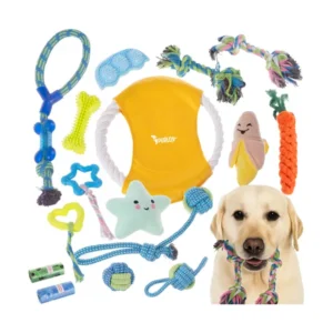 • 16 változatos játék egy csomagban: köteles húzók, gumicsont, sípoló banán plüss, frizbi, labdák és még sok más.