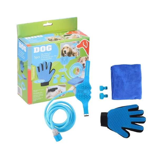 5 részes kutyamosó és -ápoló készlet tömlővel, masszázskesztyűvel