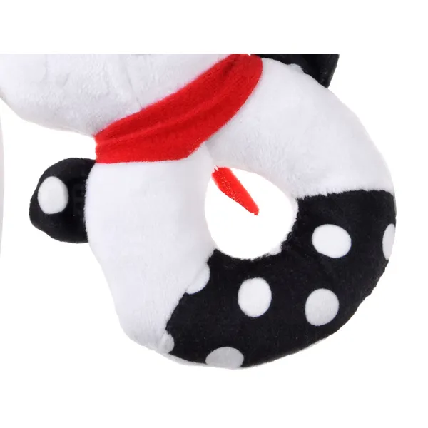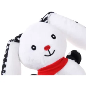 A kontrasztos fekete-fehér mintákkal díszített, 14 × 10 × 5 cm-es plüss nyuszi már újszülött kortól leköti a babák figyelmét. A piros orr és sál azonnal megragadja a tekintetet, a puha anyag pedig biztonságos ölelgetni.