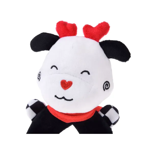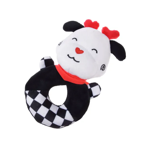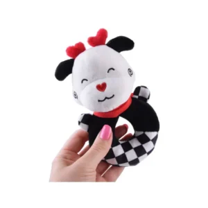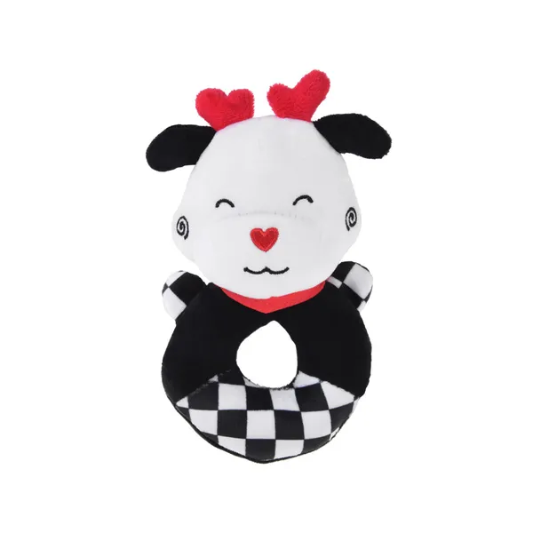 A kontrasztos csörgő plüss tehén már az első hónapoktól leköti a babák figyelmét. Fekete–fehér mintázata és élénk piros részletei segítik a szem fókuszálását, miközben barátságos mosolya megnyugtatja a kicsiket.