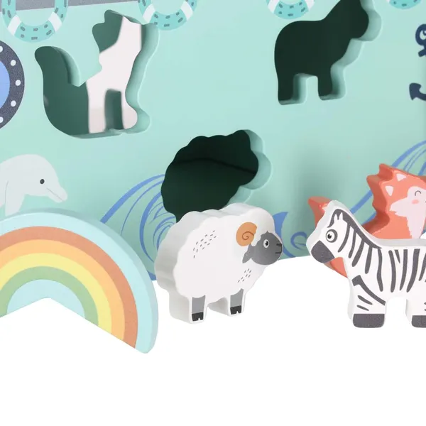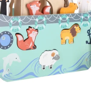 Az Arka Noé formabedobó hajó 20 darab, vízbázisú festékkel színezett fa elemből áll, és már 12 hónapos kortól biztonságos. A kicsik a megfelelő nyílásokba illeszthetik a páros állatfigurákat, miközben fejlődik a szem-kéz koordinációjuk, a formafelismerésük és a türelmük.