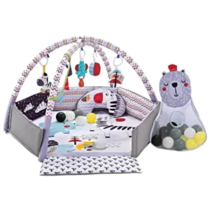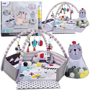 Összecsukható szőnyeg, azaz játszótér, elég felemelni a szőnyeg falait (tépőzárral rögzíthetők), hogy játszóteret hozzunk létre egy ülő vagy mászó kisgyermek számára. A készletben található labdák még vidámabbá teszik a játékot.