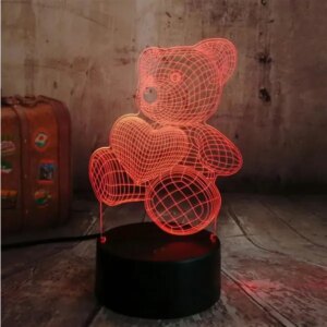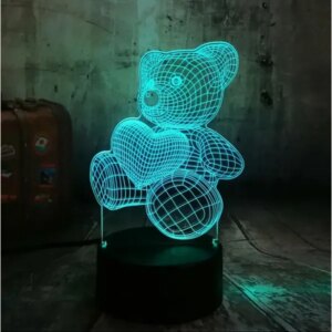 LED-es éjszakai lámpa szív alakú mackó formájú (akrillemezre nyomtatva). Sík felületre történő elhelyezésre tervezték (külön erre a célra szolgáló talapzat, amely egyben tápegységként is funkcionál). A lámpa fényes, színváltós LED háttérvilágítást használ. A lámpa 3 AA elemmel vagy hagyományos USB porton keresztül működtethető (nem kell a hálózatra csatlakoztatni). Tökéletes relaxációs világításként vagy gyermekszobai éjjeli lámpaként. Távirányítóval is rendelkezik, amellyel többféle fénymód közül választhat.