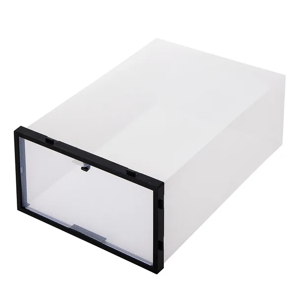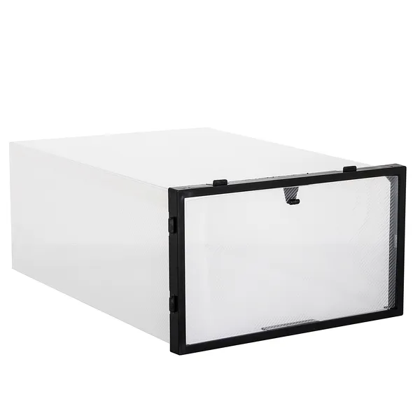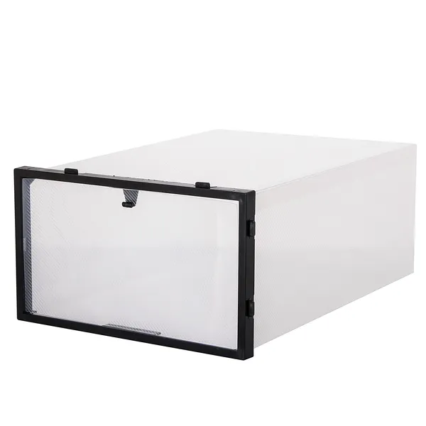 Az átlátszó, elülső nyitású cipőtároló doboz megóvja lábbelijeidet a portól, miközben egymásra rakható kialakításával értékes helyet szabadít fel a szekrényben vagy a folyosón.